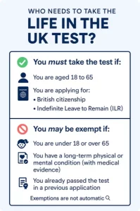 The Life in the UK Test is a computer-based test that you must pass if you want to become a British citizen or apply for indefinite leave to remain. The test is based on the official handbook 'Life in the United Kingdom: A Guide for New Residents'. It covers a wide range of topics about British history, culture, society, laws, and government. The test consists of 24 multiple-choice questions, and you have 45 minutes to complete it. You need to answer at least 18 questions correctly (75%) to pass. The questions are randomly selected from a large bank. You can book the test at official test centers across the UK. You must bring acceptable identification (like a passport or biometric residence permit). The test costs a fee.